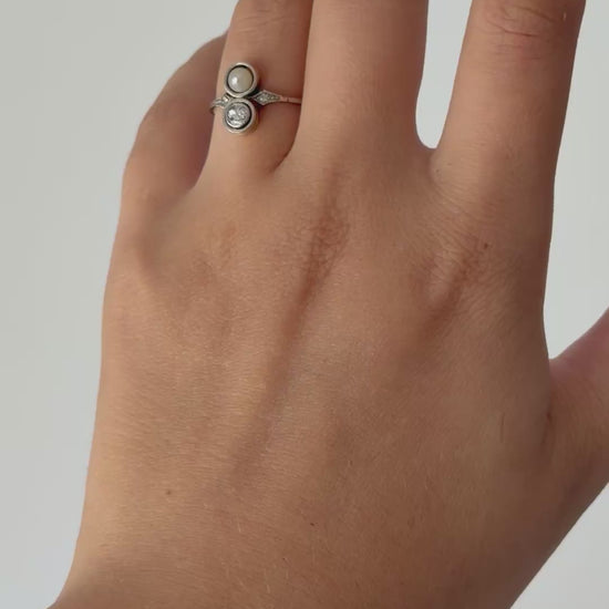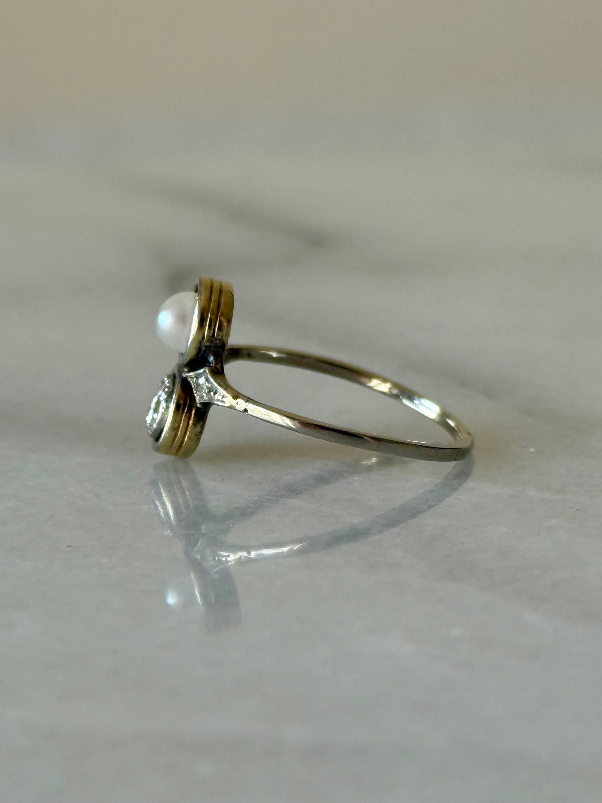 A beautiful antique Toi et Moi ring featuring an elegant pairing of an old cut diamond and a luminous natural pearl, set in 14k white gold with yellow gold detailing, c. 1910s.