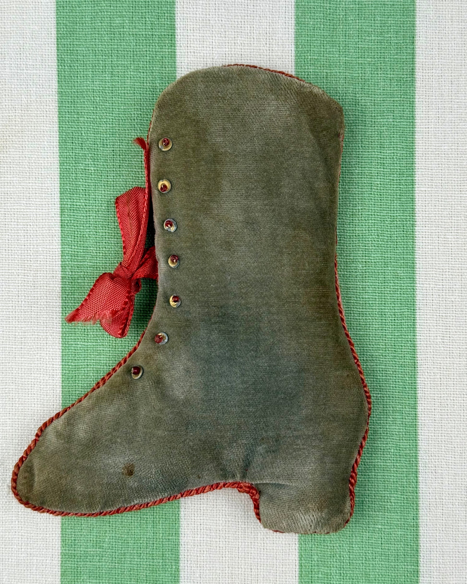 Crafted from a soft, moss-green silk velvet. It features a row of tiny metallic "buttons" along the side and is finished with a delicate twisted cord trim.