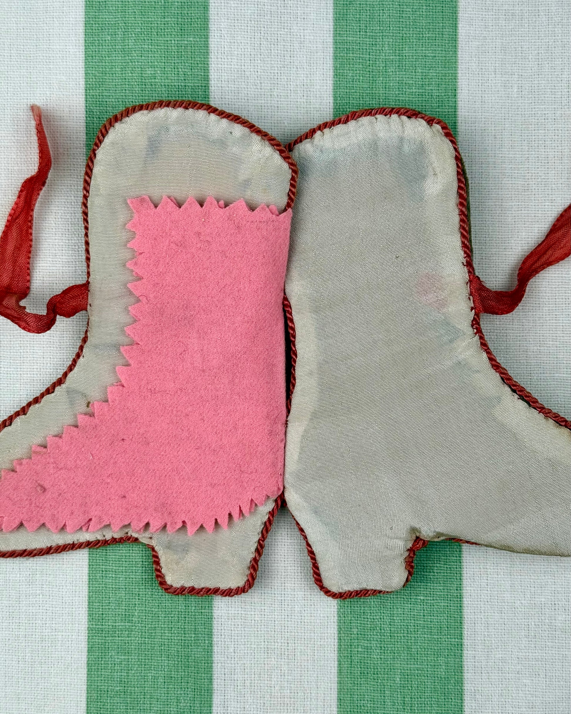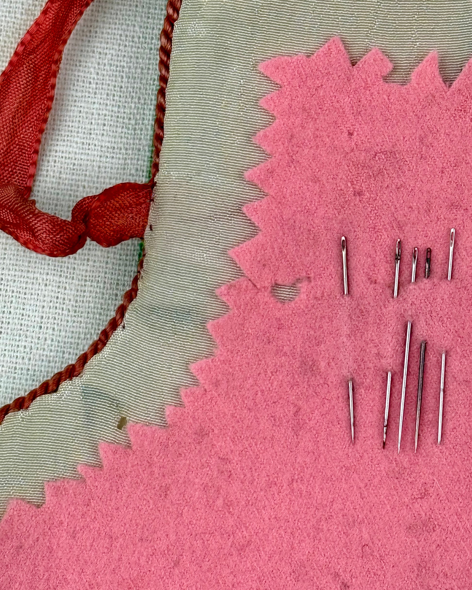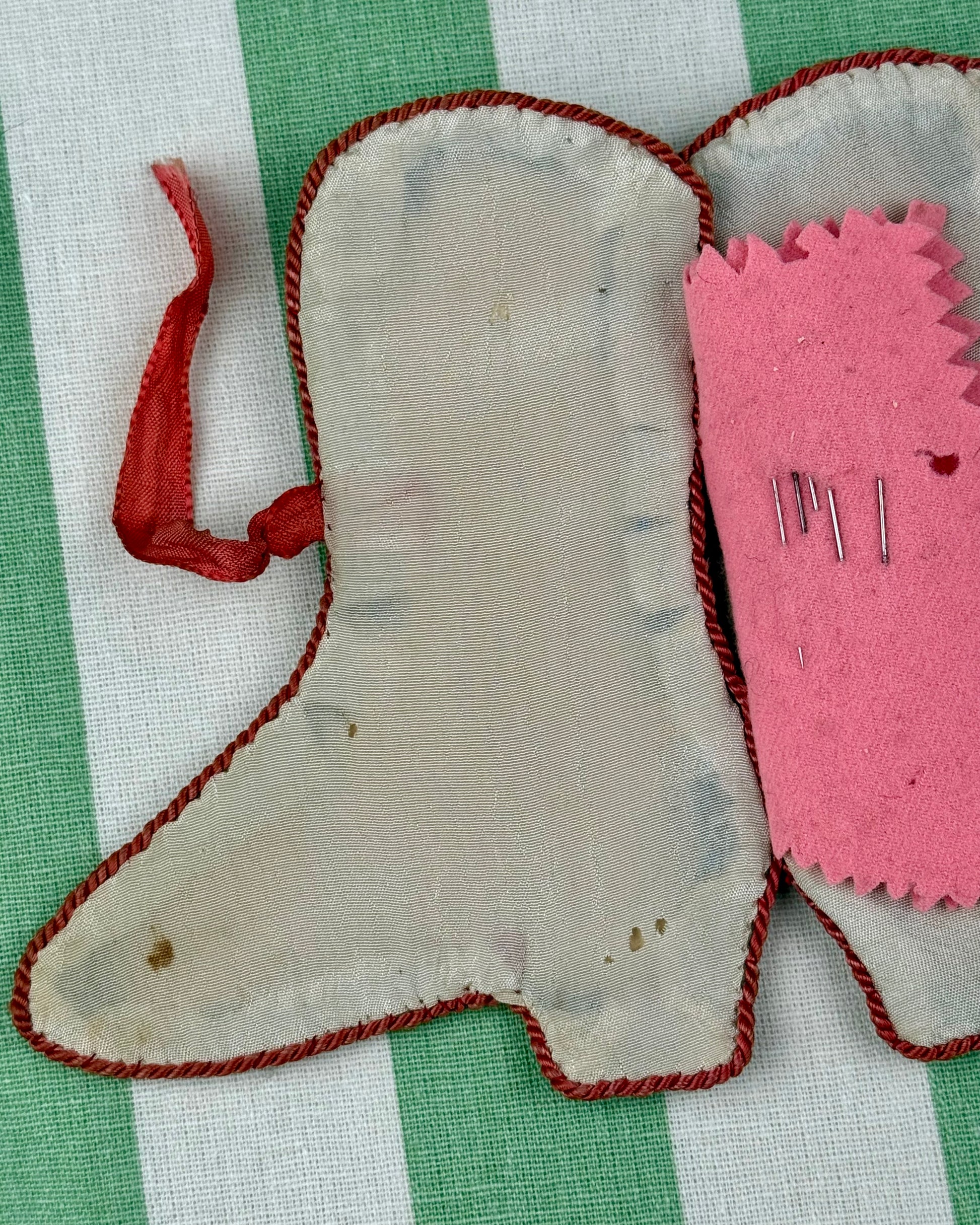 Lined in a cream-coloured silk, the case opens to reveal two "pages" of vibrant pink wool flannel with pinked (zigzag) edges. These wool pages were designed to hold needles securely while preventing rust.