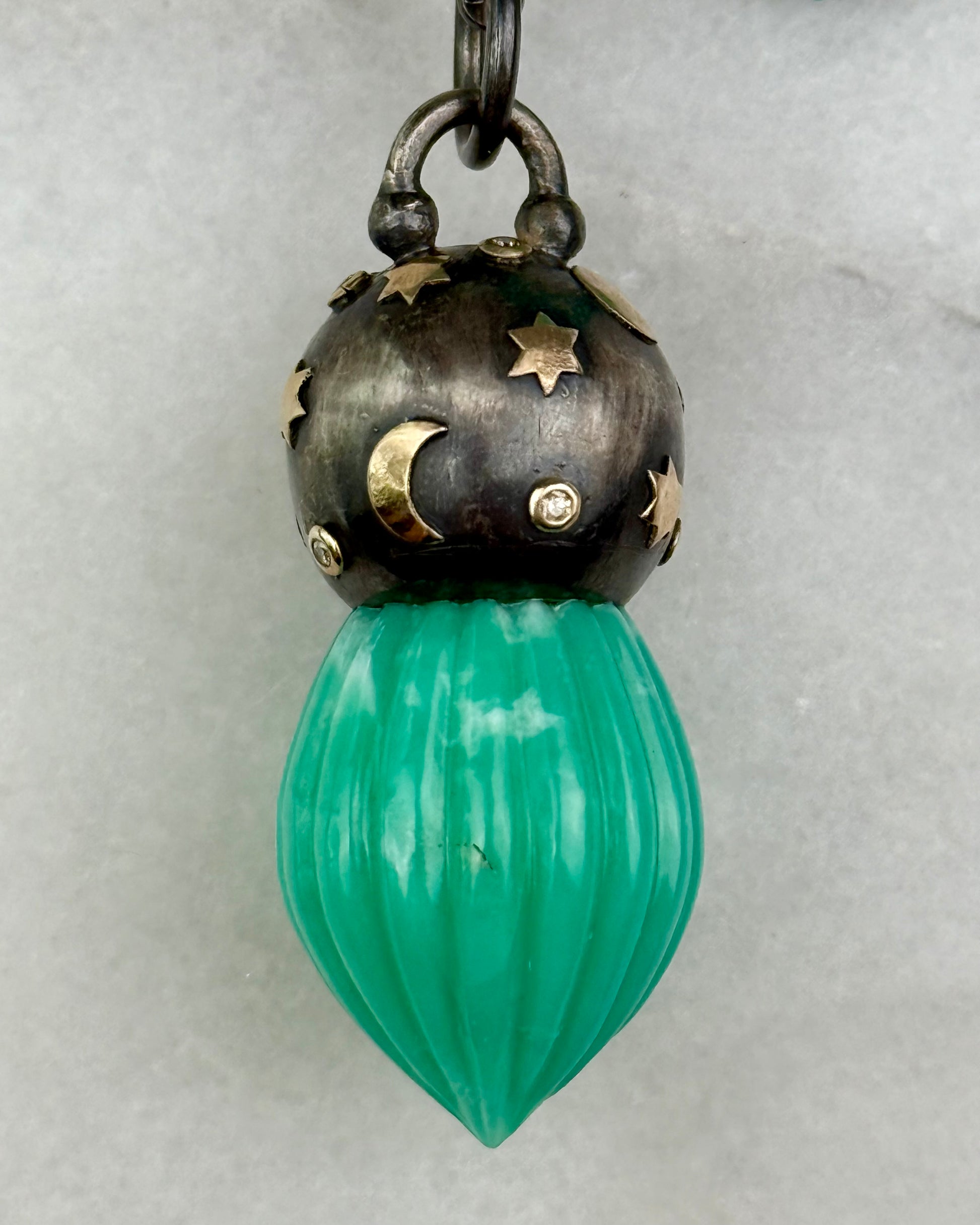 The Cielo Pendant is a striking ribbed drop of vibrant green Chrysoprase capped with oxidised sterling silver. The cap is intricately inlaid with 10k Yellow Gold stars and a crescent moon, accented by hand-set white diamonds.