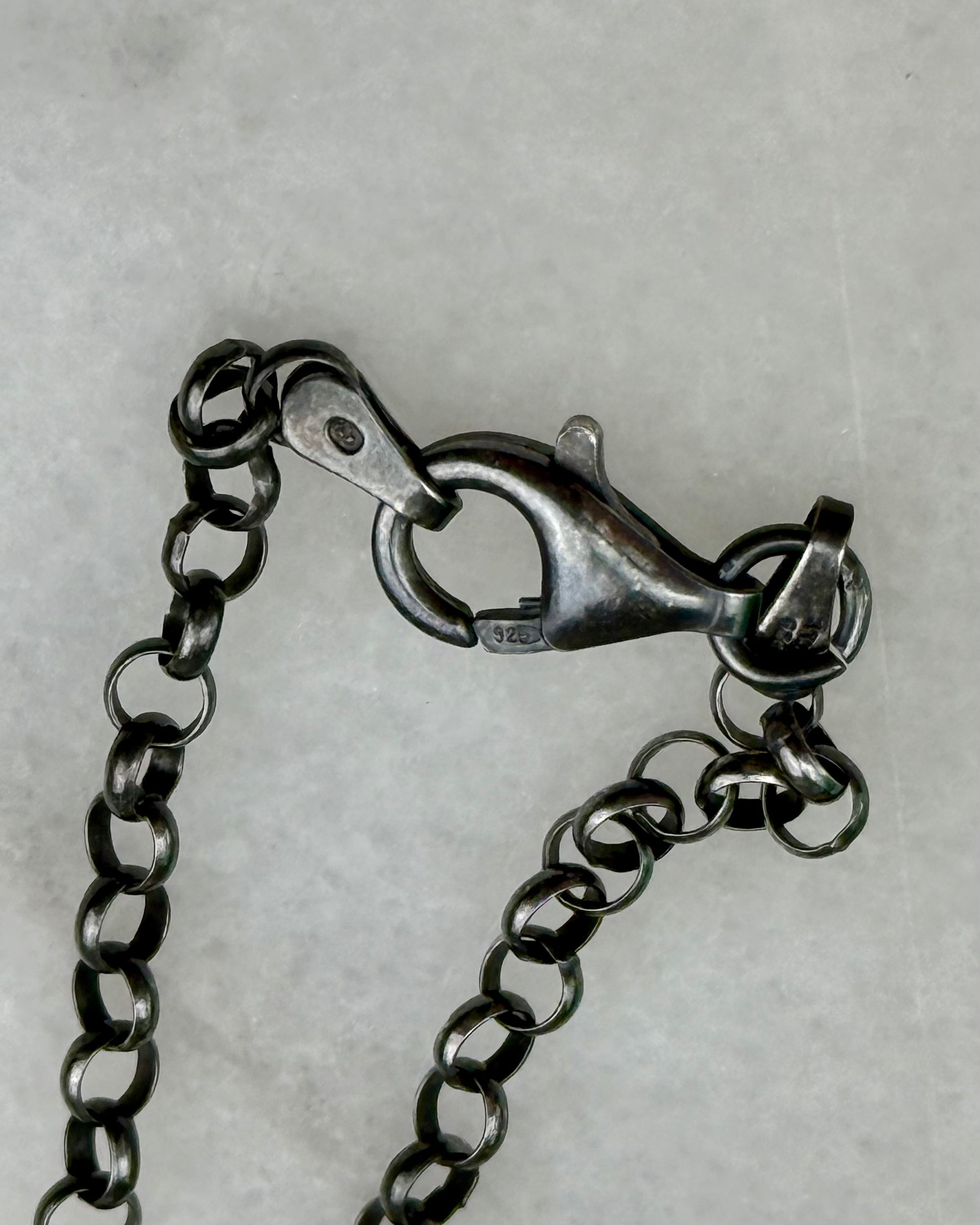 A long, designer-matched oxidised sterling silver link chain falls gracefully to the mid-chest, making it an ideal statement piece for layering or wearing over high-neck tops and sweaters.
