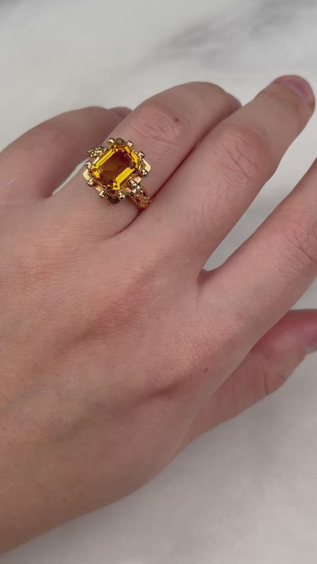 In the centre - there is one large, high-clarity emerald-cut Citrine. The stone possesses a radiant honey-gold hue that captures light beautifully through its deep step-cuts.