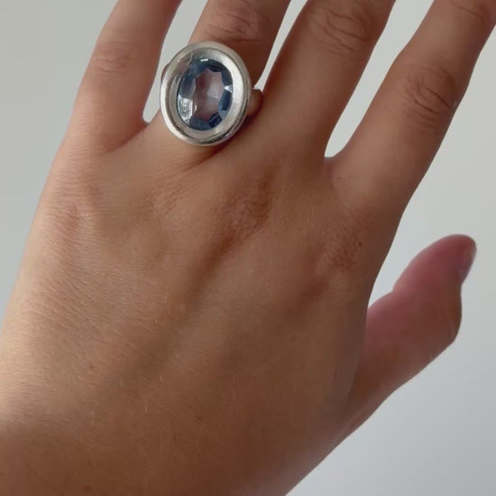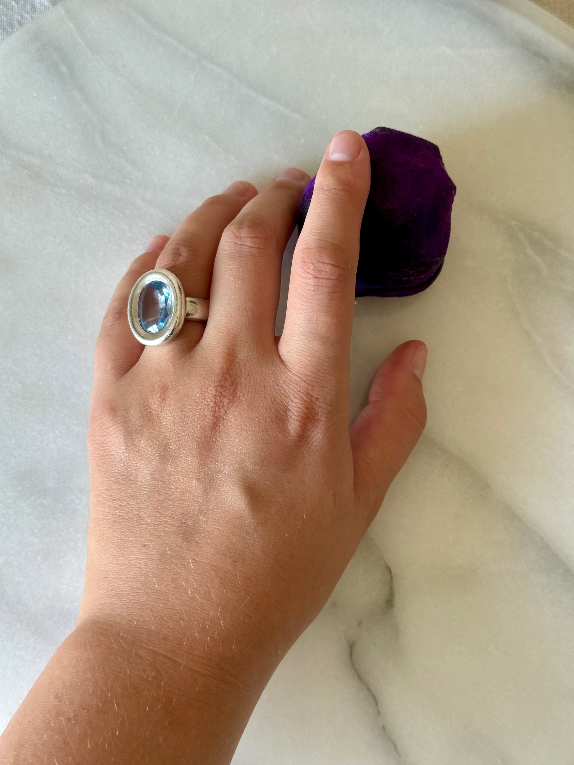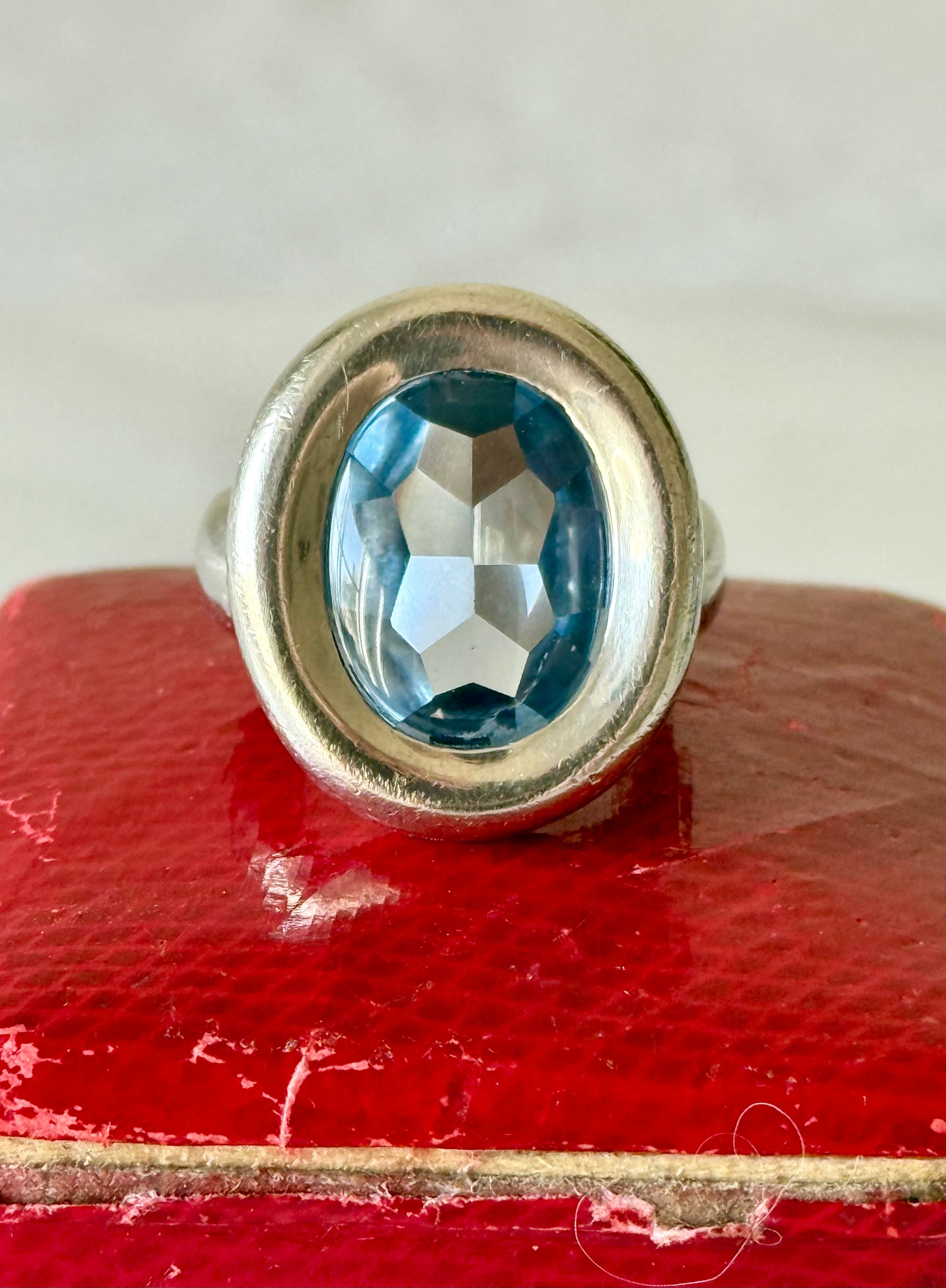 This eye-catching vintage ring features a stunning oval blue topaz set in a solid silver bezel, c. 1990s.